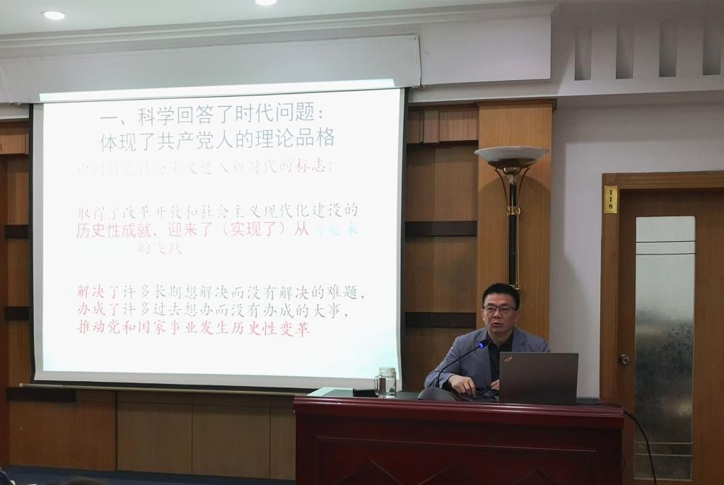 刘从德以《习近平新时代中国特色社会主义思想的原创性》为题,从习近平新时代中国特色社会主义思想科学回答了时代问题、阐明了社会主要矛盾的“变”与“不变”、形成了原创性的科学理论、规划了现代化建设的新蓝图、贡献了治理世界的中国智慧和中国方案五个方面,为全体党员系统阐述了习近平新时代中国特色社会主义思想的原创性。