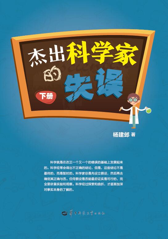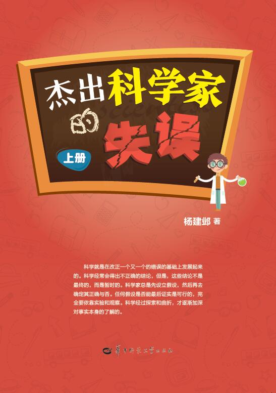 《杰出科学家的失误》由华中科技大学物理学院教授、著名科普作家杨建邺撰写,分上下两册,通过回顾科学史上著名的科学发现,生动地介绍了生物学家、化学家、物理学家、数学家、天文学家等科学家们的事迹,让读者知晓在推动人类文明进步的历程中所遭受的那些远远多于成功的挫折与失败,并从创造心理学等诸多层面分析了科学家们产生失误的原因,以及这些科学失误对科学本身所产生的巨大推动作用。该书不关注科学家取得成功的高光时刻,却关注其失败或失误的时刻,可谓独辟蹊径。
