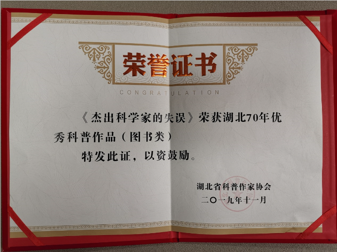 11月26日,“湖北70年科普作品展”开幕式暨表彰优秀科普作品、优秀科普人物活动在长江出版传媒集团举行。我社出版的《杰出科学家的失误》获评“湖北70年优秀科普作品(图书类)”,编辑刘满元荣获“湖北70年优秀科普工作者”称号。