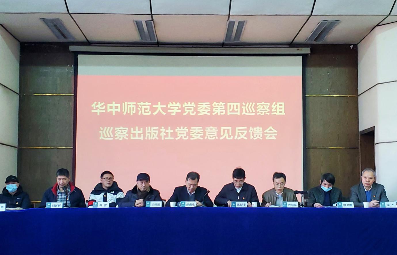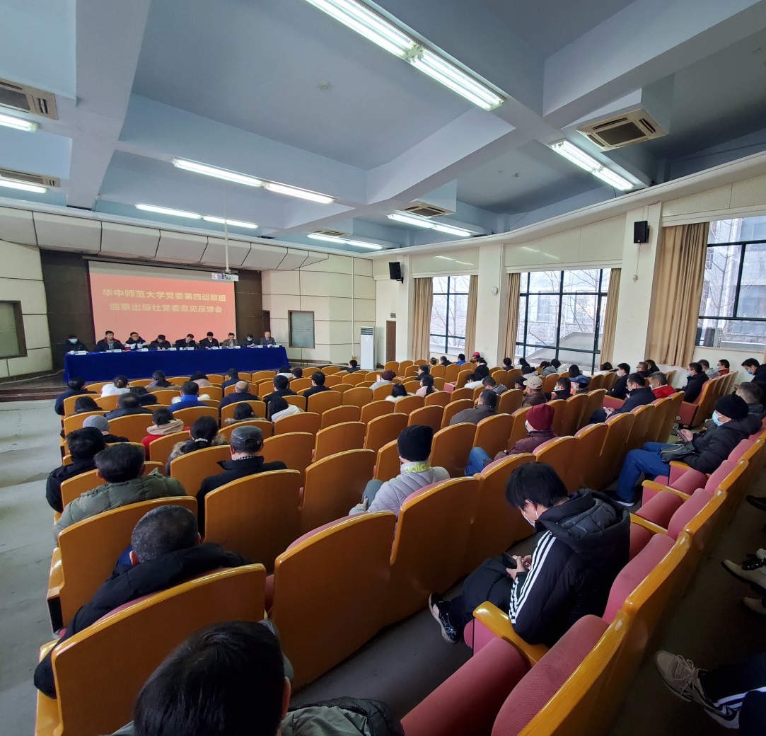 根据学校党委的统一部署,2020年12月31日上午,华中师范大学党委第四巡察组巡察出版社党委意见反馈会在九号教学楼一楼报告厅举行。校党委常委、副校长彭南生,校党委副书记、纪委书记、学校巡察工作领导小组副组长陈厚丰,第四巡察组全体成员出席会议。出版社、学报领导班子成员、党委委员、在职教职工及离退休教职工代表与会。