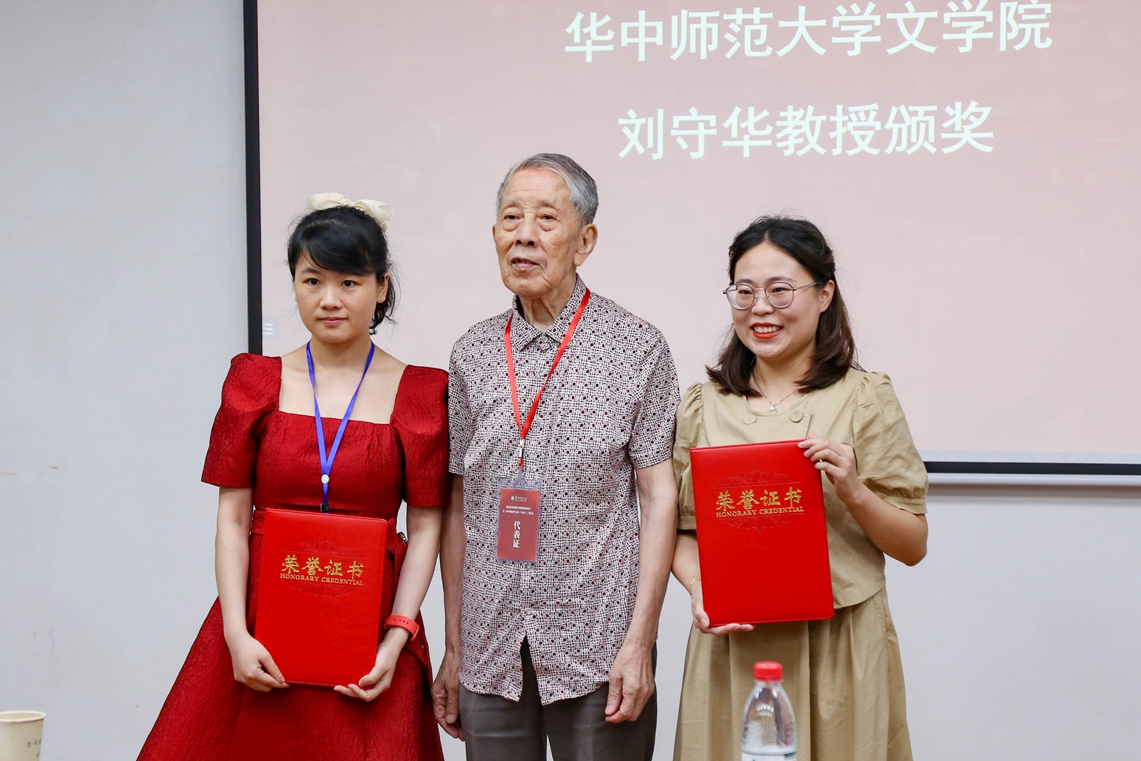 闭幕式上,刘守华先生为我校2019级中国民间文学博士生程萌同学和硕士生张紫怡同学颁发第三届刘守华奖学金获奖证书。
