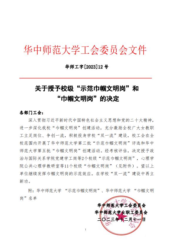 近日,华中师范大学工会委员会印发了《关于授予校级“示范巾帼文明岗”和“巾帼文明岗”的决定》,华中师范大学出版社总编室荣获校级“巾帼文明岗”称号。