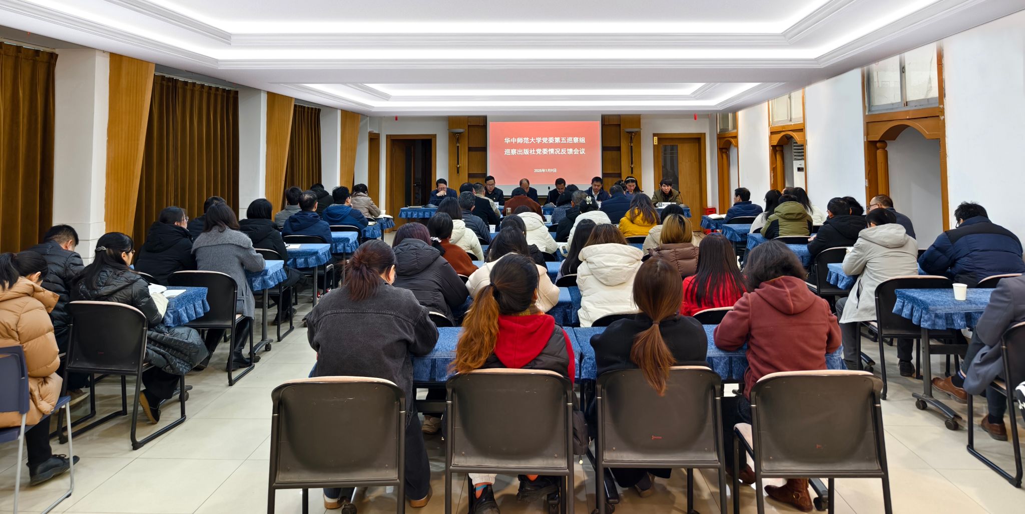 党委巡察办、纪委办、党委组织部负责同志,第五巡察组全体成员,出版社领导班子成员、在职教职工及离退休教职工代表参加会议。