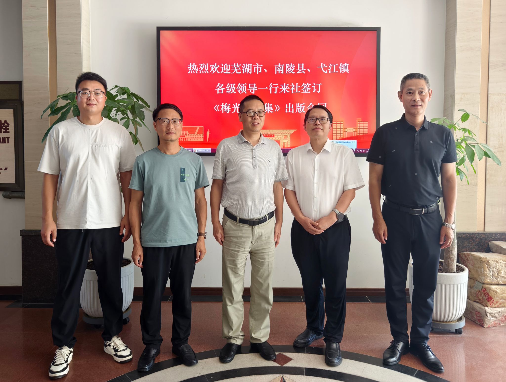 2025年7月23日上午,《梅光迪全集》出版工作座谈会暨签约仪式在我社三楼会议室举行。芜湖市委史志室方志编研科科长胡道宝、芜湖市南陵县委史志室副主任艾可保、芜湖市南陵县弋江镇党委书记周卫民、芜湖市南陵县弋江镇文化旅游办公室主任陈修原一行四人就《梅光迪全集》出版事宜来到我社进行深入交流。
