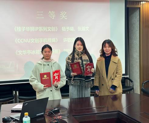 利群书社主任曾艳为三等奖获奖代表国家文化产业研究中心2024级杨予曦同学、美术学院2024级张瀚文同学团队,以及优秀奖获奖代表历史文化学院2022级吴尚欣同学颁奖。