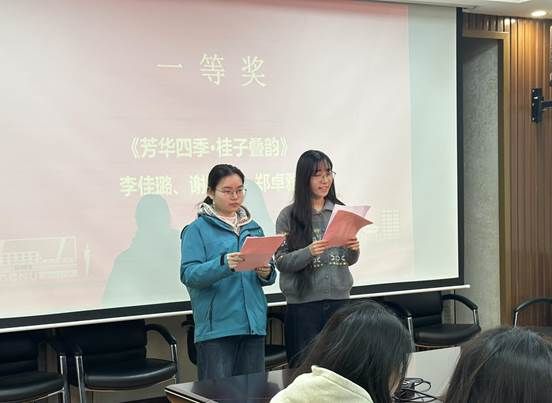 在颁奖环节,付义朝社长与校团委苏晓刚书记共同为一等奖获奖团队——人工智能教育学部2022级的李佳璐同学、谢锦文同学、郑卓雅同学颁发证书及奖金。