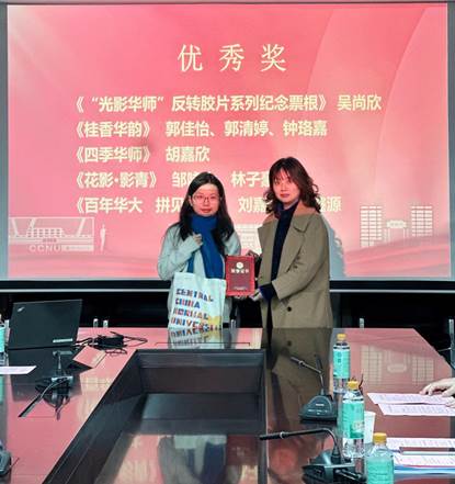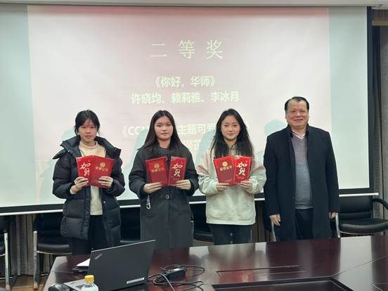 石炜为二等奖获得者颁奖,获奖代表为美术学院2023级许晓均同学、赖莉雅同学、李冰月同学团队,文学院2023级姜璎芷同学。