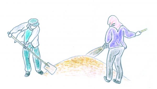 趁着清晨的凉风,趁着新浇的湿地,扛着铁锹,拎着筐,人们都来种秋白菜。