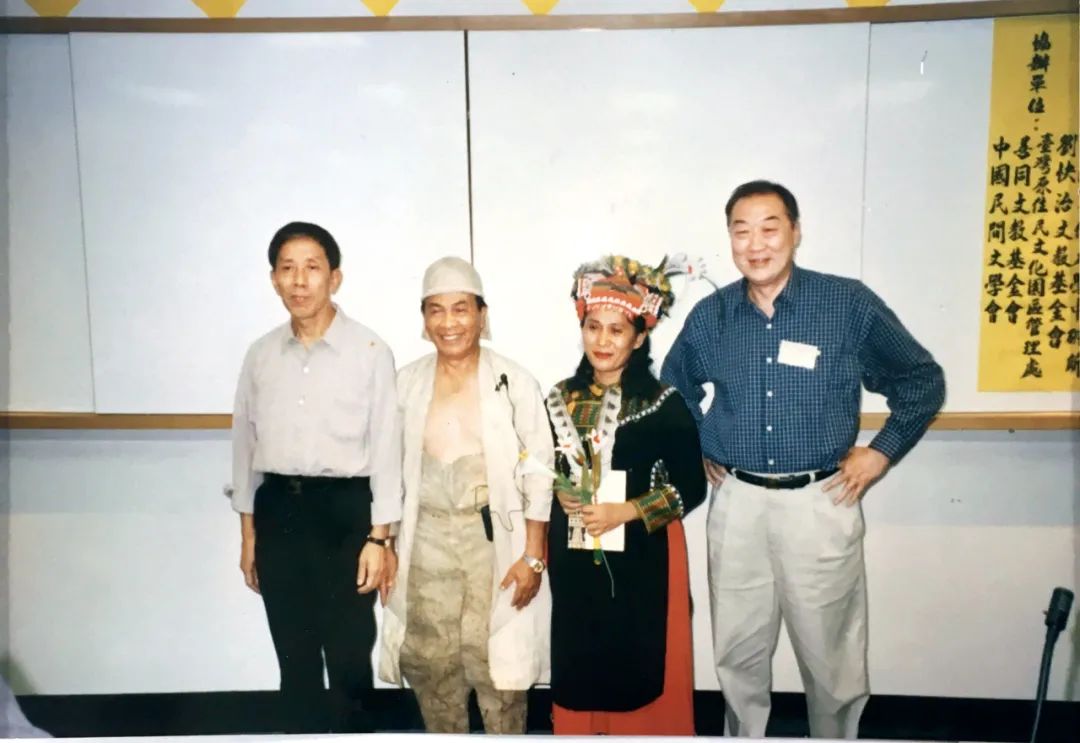 △在中国台湾屏东县考察研究鲁凯族民间故事的刘守华(左一)和台湾文化大学教授金荣华(右一)(1995年8月)